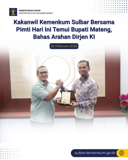 Berita Baru Info Sulawesi Barat KEMENTRIAN HUKUM Berita Baru Info Sulawesi Barat KEMENTRIAN HUKUM Perkuat Perlindungan KI, Kakanwil Kemenkum Sulbar dan Bupati Mateng Bahas Langkah Strategis February 26, 2026 • MAMUJU TENGAH – Kepala Kantor Wilayah Kementerian Hukum (Kakanwil Kemenkum) Sulawesi Barat, Saefur Rochim, melakukan...