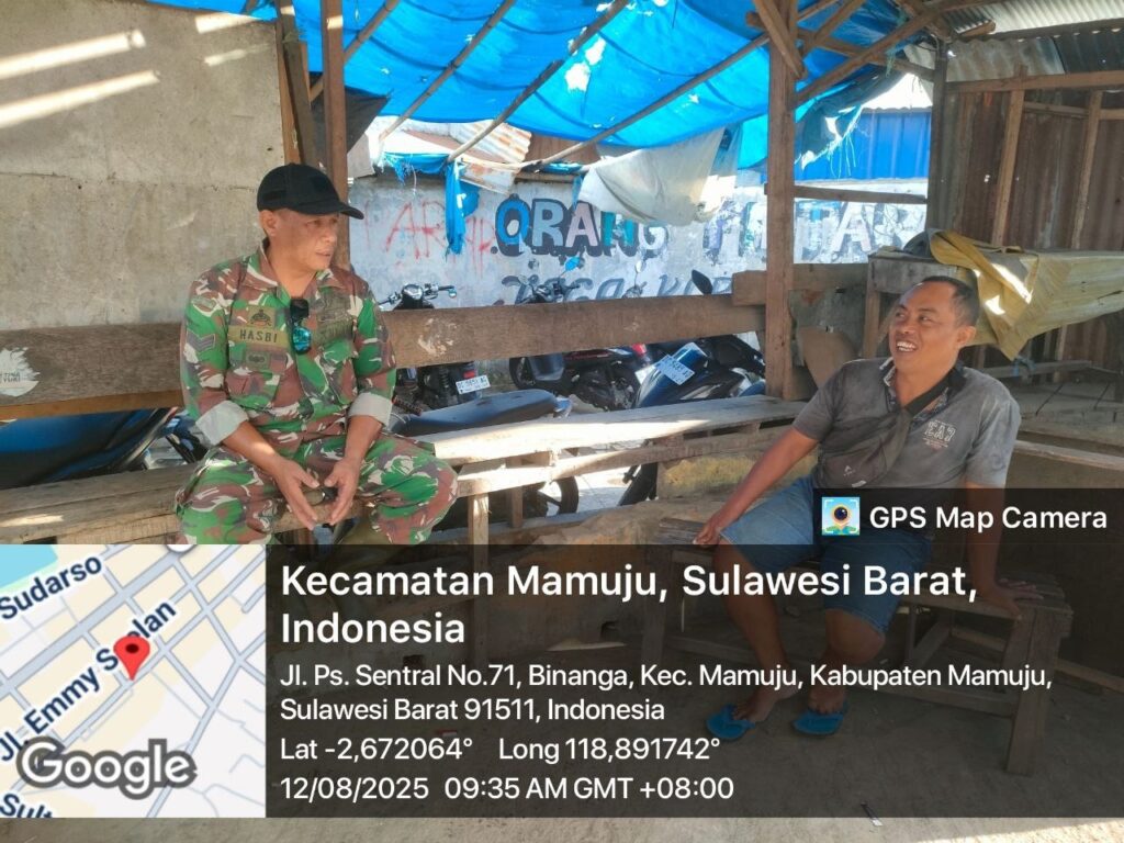 Mamuju — Babinsa Kodim 1418/Mamuju melaksanakan kegiatan Komunikasi Sosial (Komsos) bersama masyarakat di Kelurahan Binanga, Kecamatan Mamuju, Kabupaten Mamuju. Dalam kegiatan ini, Babinsa memanfaatkan momen tatap muka untuk mengajak warga lebih peduli terhadap kebersihan lingkungan sebagai bagian dari upaya menjaga kesehatan dan kenyamanan bersama. Selasa (12/8/2025).