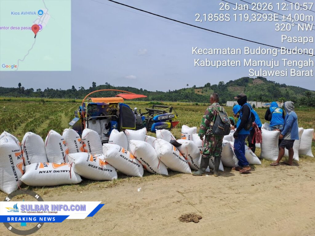 Mamuju Tengah – Babinsa Kodim 1418/Mamuju terus menunjukkan komitmennya dalam pembinaan wilayah melalui pendampingan sektor pertanian. Kali ini, Babinsa memimpin langsung kegiatan panen padi seluas kurang lebih 8 hektare bersama Kelompok Tani Usaha Baru di Desa Pasapa, Kecamatan Budong-Budong, Kabupaten Mamuju Tengah. Senin (26/1/2026).