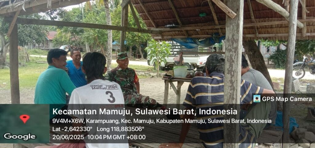 MAMUJU , SULBAR INFO— Dalam upaya memperkuat kewaspadaan masyarakat terhadap potensi bencana alam, Babinsa Koramil 1418-01/Mamuju, Kopda Ra’uf, yang merupakan Babinsa Desa Karampuang, melaksanakan kegiatan pembinaan wilayah yang dilanjutkan dengan komunikasi sosial (komsos) bersama Masyarakat Desa Karampuang, Kecamatan Mamuju. Jumat (20/6/2025).
