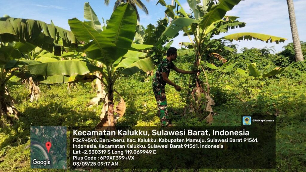 Mamuju, – Dalam rangka mendukung program ketahanan pangan, Babinsa Koramil 1418-03/Kalukku melaksanakan kegiatan perawatan tanaman pisang Cavendis dan pemeliharaan kolam ikan nila yang berlokasi di Dusun Taraweh, Desa Beru-beru, Kecamatan Kalukku, Kabupaten Mamuju. Rabu (3/9/2025).