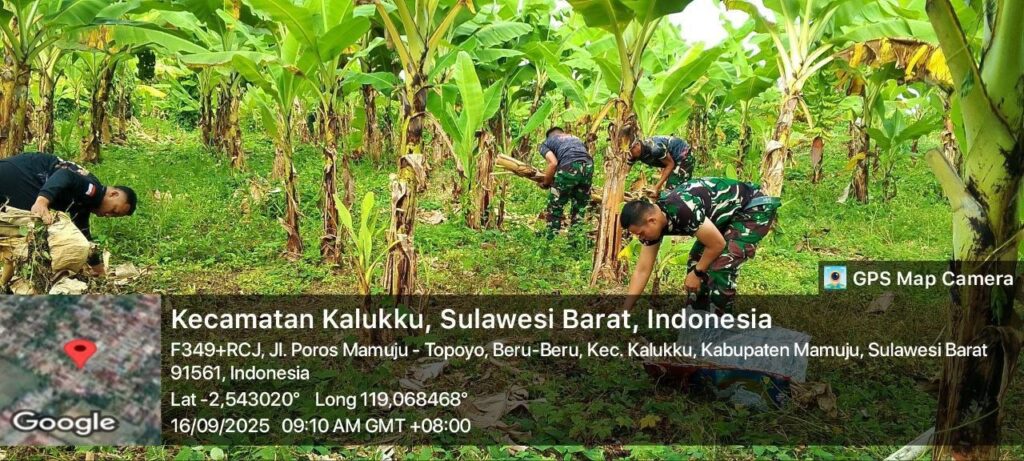 Mamuju, – Babinsa Koramil 1418-03/Kalukku melaksanakan kegiatan perawatan tanaman pisang cavendis dan pepaya di lahan Korem yang dikelola oleh Kodim 1418/Mamuju, berlokasi di Dusun Taraweh, Desa Beru-beru, Kecamatan Kalukku, Kabupaten Mamuju. Selasa (16/09/2025).