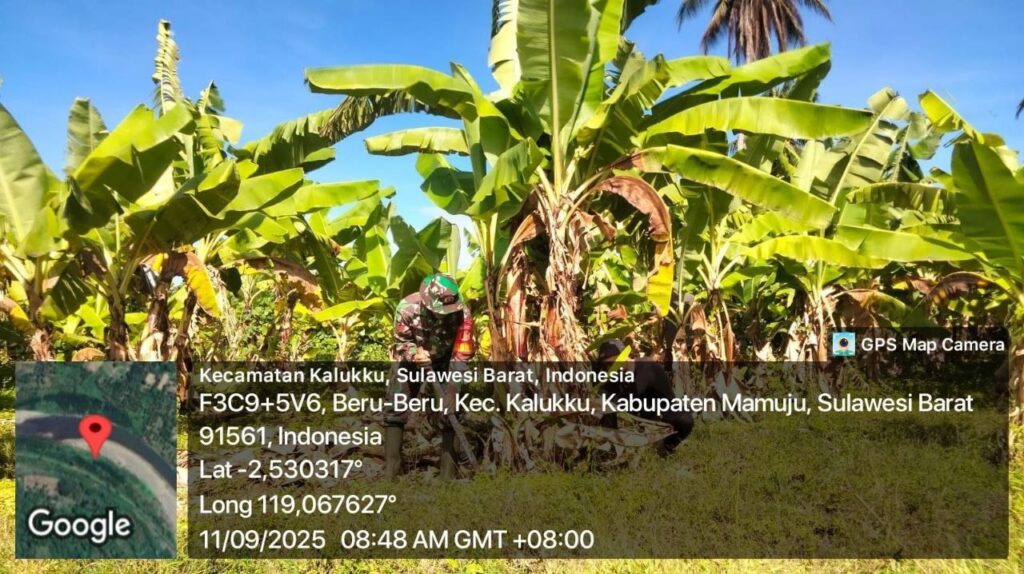 Mamuju – Dalam rangka mendukung program ketahanan pangan, Babinsa Koramil 1418-03/Kalukku melaksanakan kegiatan perawatan tanaman pisang Cavendish dan pepaya di lahan Korem 142/Tatag yang berlokasi di Dusun Taraweh, Desa Beru-beru, Kecamatan Kalukku, Kabupaten Mamuju. Kamis (11/9/2025).