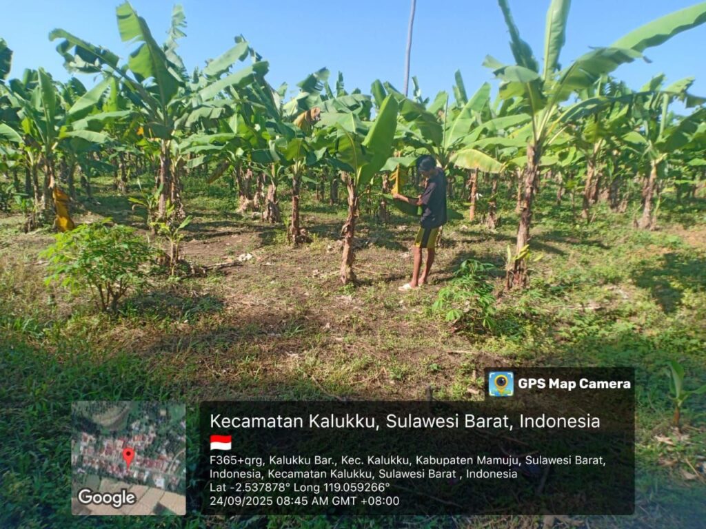 Mamuju – Dalam upaya mendukung program ketahanan pangan nasional, Babinsa Koramil 1418-03/Kalukku melaksanakan perawatan tanaman pisang cavendis dan bibit cabe di lahan Korem yang dikelola oleh Kodim 1418/Mamuju, berlokasi di Dusun Taraweh, Desa Beru-beru, Kecamatan Kalukku, Kabupaten Mamuju, Rabu (24/9/2025).