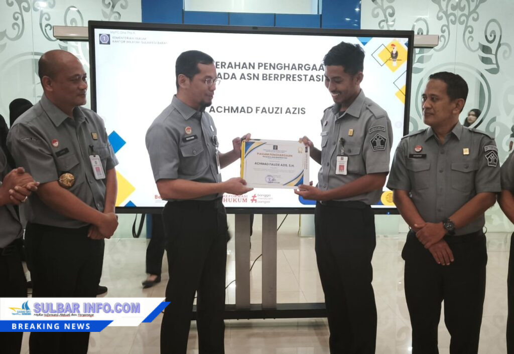 Mamuju – Kepala Kantor Wilayah Kementerian Hukum Sulawesi Barat, Saefur Rochim, menyerahkan piagam penghargaan kepada pegawai teladan di lingkungan kerjanya sebagai bentuk apresiasi atas kinerja dan dedikasi yang telah ditunjukkan.