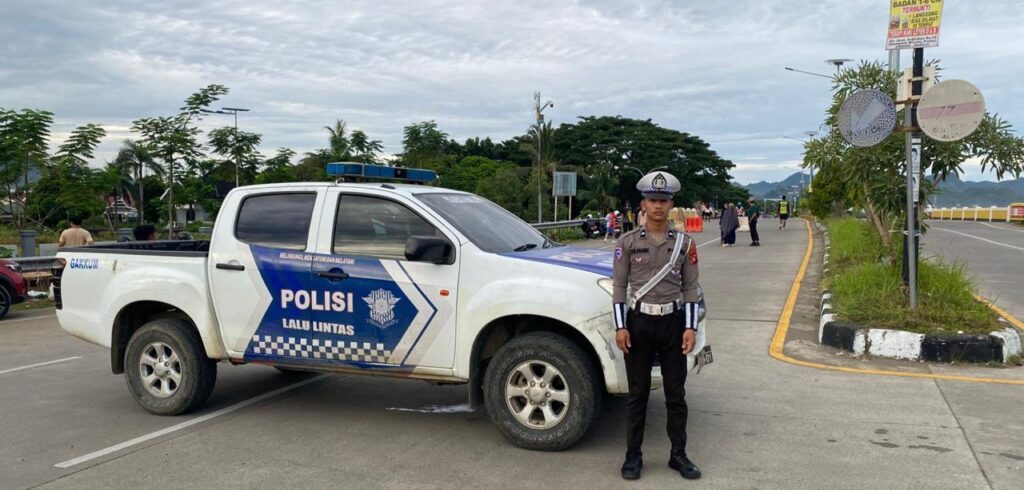 Mamuju – Untuk mendukung pelaksanaan kegiatan Car Free Day (CFD) yang rutin digelar setiap Minggu pagi, personel Satuan Lalu Lintas Polresta Mamuju melaksanakan pengamanan dan penutupan sementara Jalan Arteri Mamuju pada Minggu (19/01).