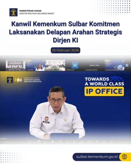 Berita Baru Info Sulawesi Barat KEMENTRIAN HUKUM Berita Baru Info Sulawesi Barat KEMENTRIAN HUKUM Kanwil Kemenkum Sulbar Komitmen Laksanakan Delapan Arahan Strategis Dirjen KI February 25, 2026 • MAMUJU – Kepala Kantor Wilayah Kementerian Hukum Sulawesi Barat, Saefur Rochim, menegaskan komitmennya untuk mendukung...