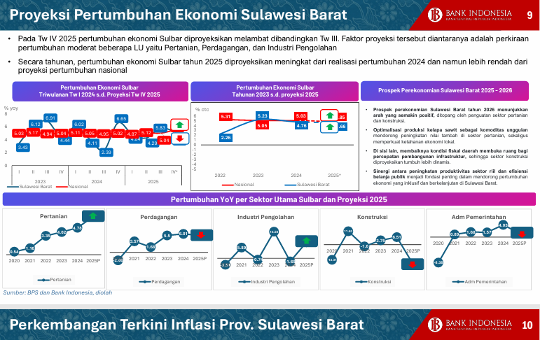 Proyeksi Pertumbuhan Ekonomi Sulawesi Barat Pada Tw IV 2025 pertumbuhan ekonomi Sulbar diproyeksikan melambat dibandingkan Tw III. Faktor proyeksi tersebut diantaranya adalah perkiraan pertumbuhan moderat beberapa LU yaitu Pertanian, Perdagangan, dan Industri Pengolahan