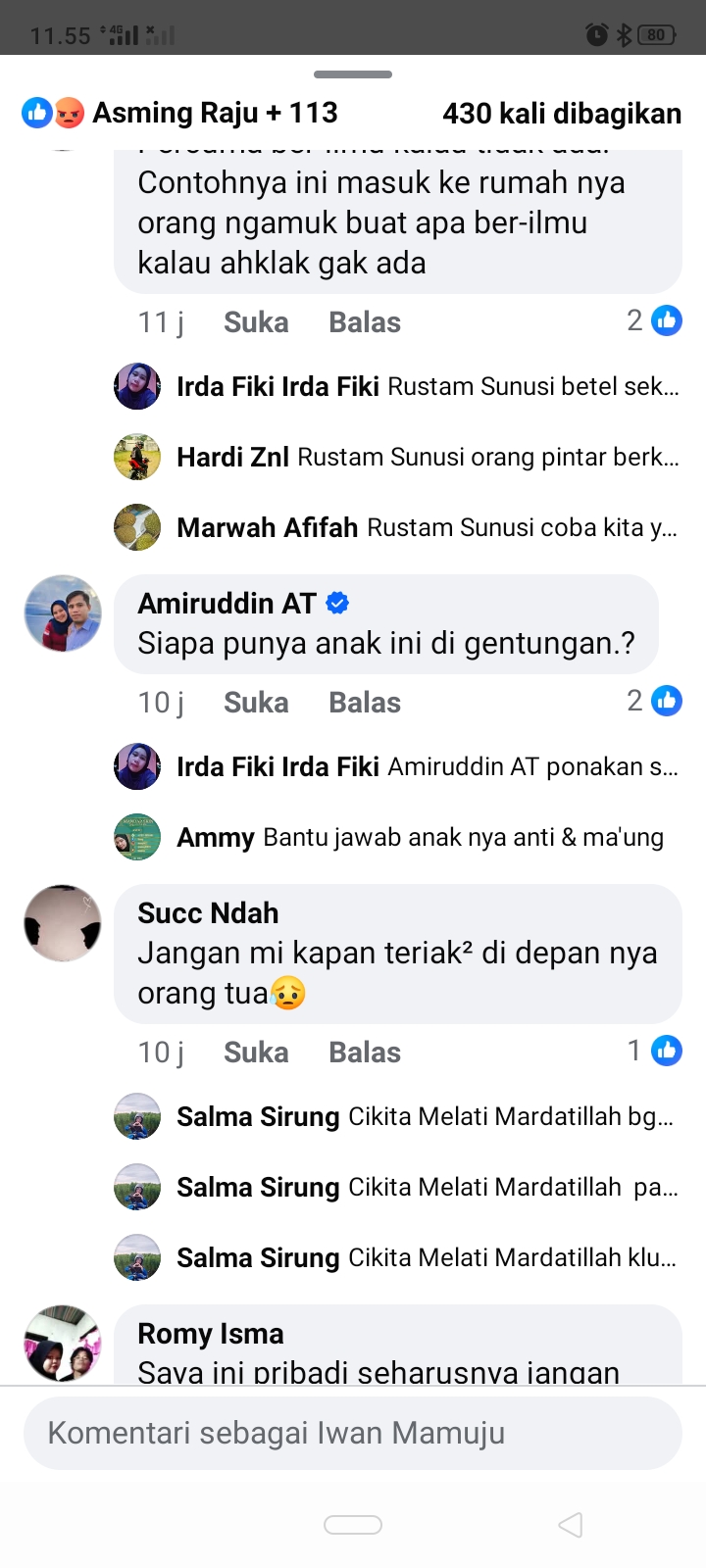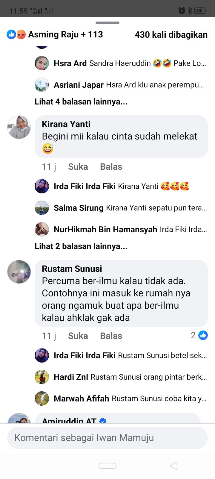 Setidaknya kurang lebih 500 komentar menanggapi kejadian tersebut yang diantanya @appy alfiansyahrin (Persoalan cinta bosku bukan persoalan negara) @ rustam sanusi (tidak ada etikanya ini masuk dirumahnya orang memgamuk apa lagi persoalan conta mau diapa kalau suka sama suka.