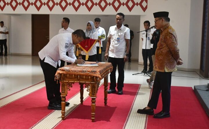 MAMUJU, SULBAR INFO – Para Pimpinan Organisasi Perangkat Daerah (OPD) Lingkup Pemprov Sulbar melakukan Penandatanganan Pakta Integritas dan Perjanjian Kinerja Pejabat Pimpinan Tinggi Pratama dihadapan langsung Gubernur Sulbar, Suhardi Duka, berlangsung di Ballroom Andi Depu Lantai 3 Kantor Gubernur Sulbar, Rabu, 16 Juli 2025 malam.