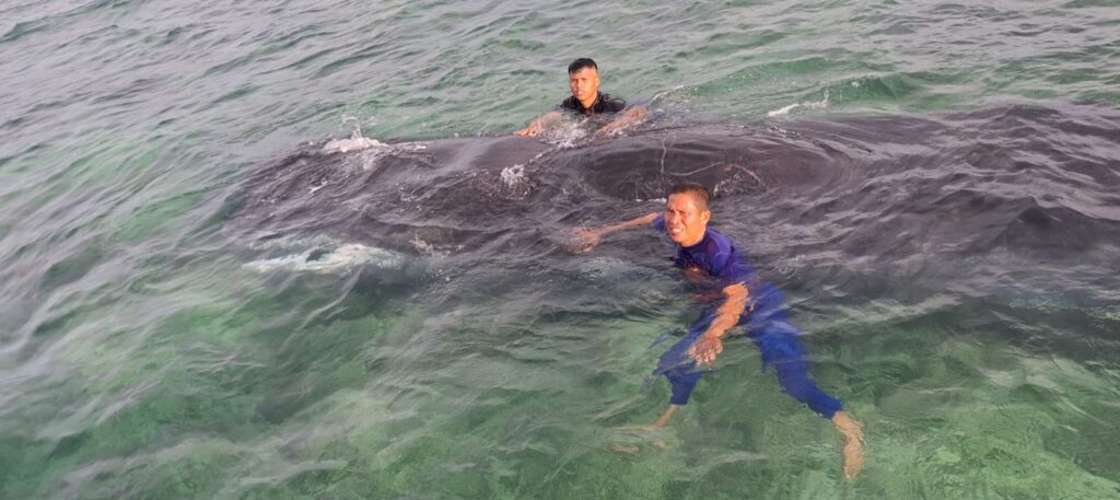 Ikan Paus Terdampar di Pesisir Pulau Karampuang, Sat Polair Polresta Mamuju Lakukan Penanganan