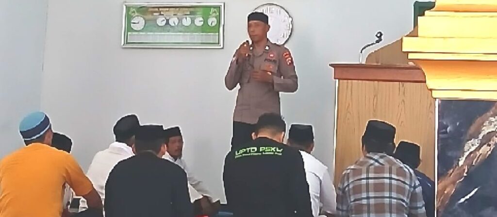 Mamuju – Usai melaksanakan ibadah Shalat Jumat secara berjamaah, Kanit Binmas Polsek Mamuju, Aiptu Awaluddin, memberikan himbauan kamtibmas kepada para jamaah Masjid Nur Azizah di Desa Tadui, Kecamatan Mamuju. Jumat, 1 Agustus 2025