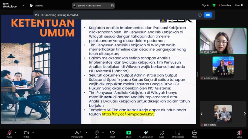 Kegiatan ini dihadiri oleh Kepala Divisi P3H, Ketua Tim Kelompok Kerja (Pokja) Program Strategi Kebijakan Hukum, Tim Analisis Implementasi Kebijakan Hukum Kantor Wilayah, serta Sabrina Nadia, Person in Charge (PIC) kegiatan Analisis Implementasi Evaluasi Kebijakan (AIEK) dari Badan Strategi Kebijakan (BSK) Kemenkum untuk wilayah Sulawesi Barat.