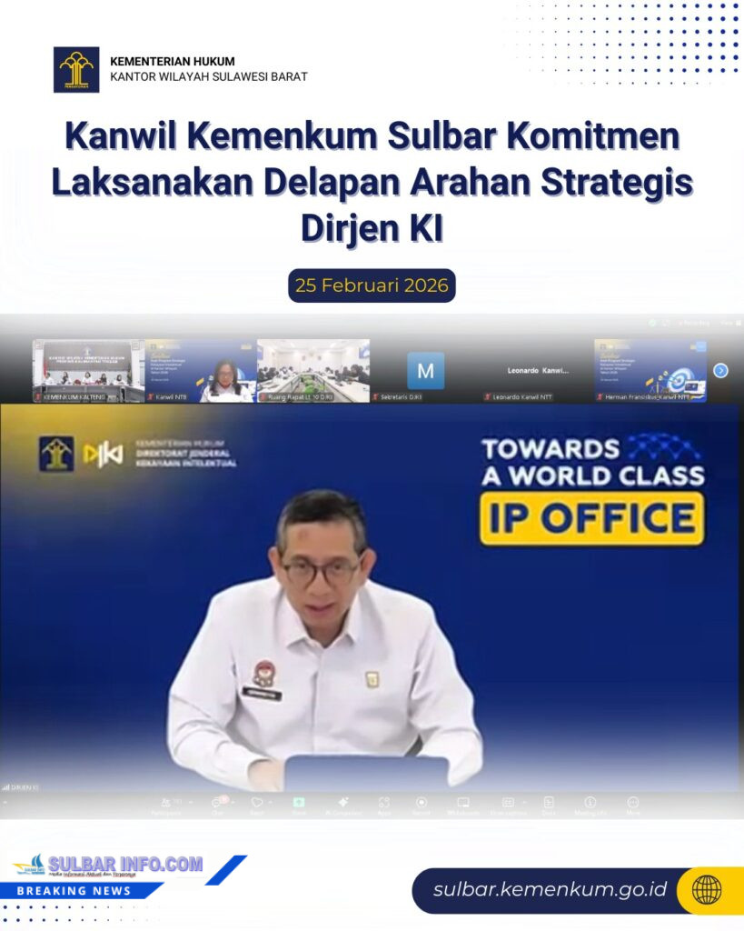 Hal itu disampaikannya usai mengikuti Sosialisasi Arah Program Strategis Kekayaan Intelektual (KI) yang diselenggarakan secara daring oleh Direktorat Jenderal Kekayaan Intelektual (DJKI), Rabu (25/2/2026), di Ruang Media Center Kanwil Kemenkum Sulbar bersama Kadiv Yankum, Hidayat Yasin, Kadiv P3H John Batara Manikallo, Kabid KI, Juani dan sejumlah jajaran.