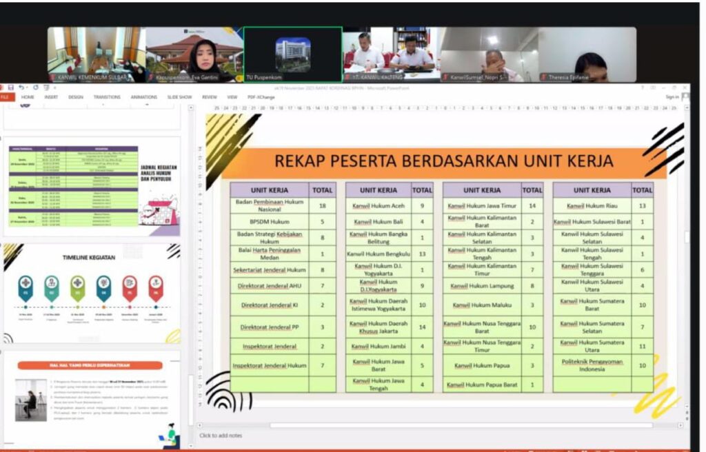 Mamuju, 19 November 2025 – Kantor Wilayah Kementerian Hukum Sulawesi Barat menghadiri Koordinasi Penilaian Kompetensi Jabatan Fungsional (Jafung) Analis Hukum dan Penyuluh Hukum Tahun di Lingkungan Kementerian Hukum Tahun 2025 secara virtual.