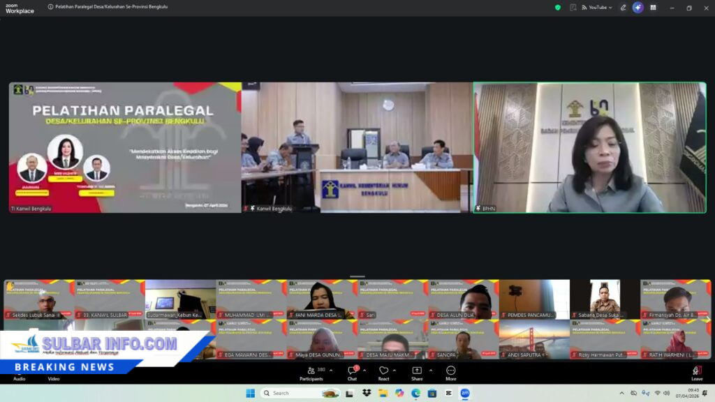 Mamuju, 7 April 2026 — Kantor Wilayah Kementerian Hukum Sulawesi Barat menunjukkan komitmennya dalam memperluas akses keadilan bagi masyarakat dengan mengikuti kegiatan pembukaan Pelatihan Paralegal Desa/Kelurahan se-Provinsi Bengkulu Tahun 2026 secara virtual, Selasa (7/4).