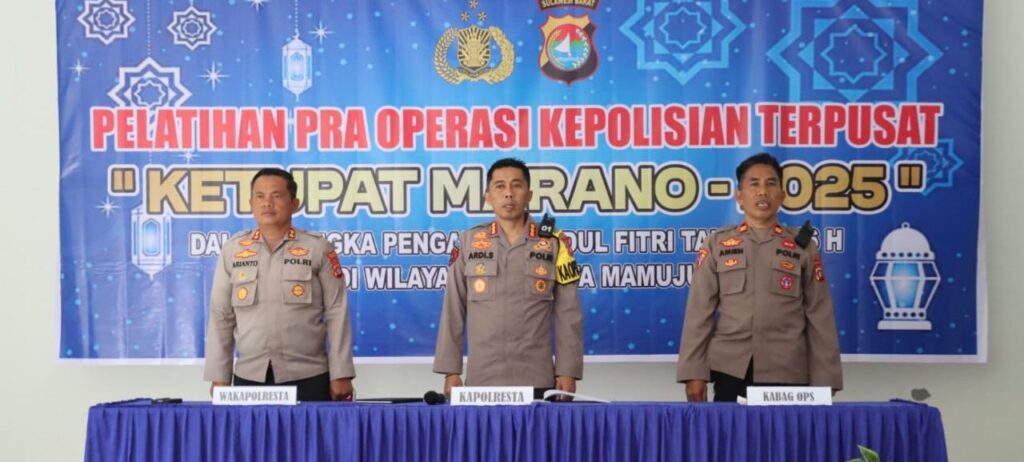 MAMUJU, SULBAR INFO– Menjelang Hari Raya Idul Fitri 1446 Hijiriah / 2025 Masehi, Polresta Mamuju gelar Latihan Pra Operasi Ketupat Marano 2025 bertempat di Aula Wira Satya Polresta Mamuju Jalan KS. Tubun Mamuju. Rabu, 19 Maret 2025
