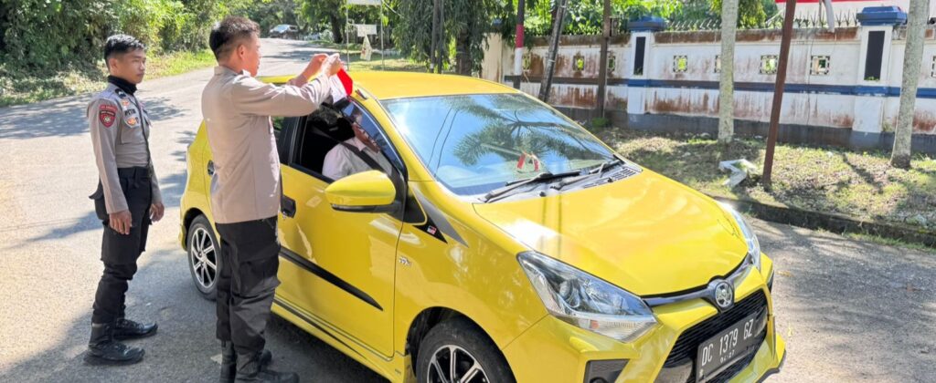 Mamuju – Menyemarakkan peringatan Hari Ulang Tahun ke-80 Kemerdekaan Republik Indonesia, Kasat Binmas Polresta Mamuju AKP Andi Rady bersama Bhabinkamtibmas Polsek Mamuju gelar pembagian bendera Merah Putih kepada para pengendara mobil yang melintas di Jalan Soekarno Hatta, Kota Mamuju. Selasa, 5 Agustus 2025