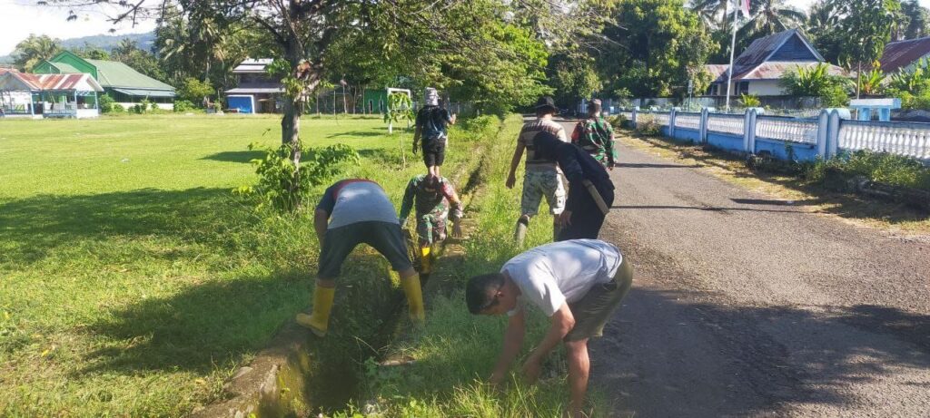 Karya bakti ini melibatkan personel TNI dan masyarakat setempat, yang bahu-membahu membersihkan lumpur, sampah plastik, dan material lainnya yang menyumbat saluran air. Partisipasi aktif warga menjadi bukti nyata kebersamaan dalam menjaga kebersihan dan kenyamanan desa mereka.