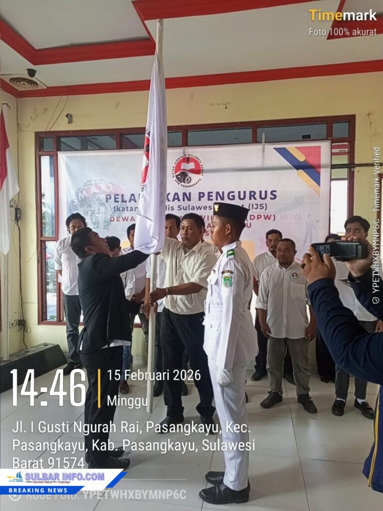 PASANGKAYU,SULBAR INFO – Estafet kepemimpinan organisasi jurnalis di Kabupaten Pasangkayu resmi bergulir. Ketua Umum Dewan Pimpinan Pusat (DPP) Ikatan Jurnalis Sulawesi Barat (IJS), Irham Aziz, S.I.P., melantik jajaran pengurus Dewan Pimpinan Wilayah (DPW) IJS Kabupaten Pasangkayu periode 2025-2029 di Hotel Devonder, Pasangkayu, Minggu (15/2/2026).