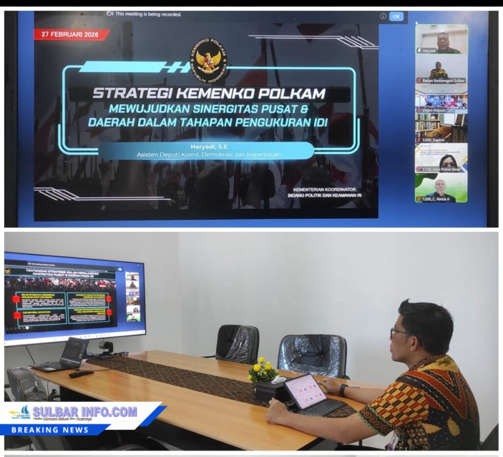 MAMUJU, — Kepala Badan Kesatuan Bangsa dan Politik (Kesbangpol) Provinsi Sulawesi Barat, Darwis Damir, menghadiri kegiatan Monitoring dan Evaluasi (Monev) Hasil Pelaksanaan Focus Group Discussion (FGD) Indeks Demokrasi Indonesia (IDI) Tingkat Provinsi Tahun 2025. Kegiatan tersebut dilaksanakan secara daring oleh Direktorat Jenderal Politik dan Pemerintahan Umum Kementerian Dalam Negeri Republik Indonesia, Jumat (27/2/2026) di Kantor Badan Kesbangpol Sulbar