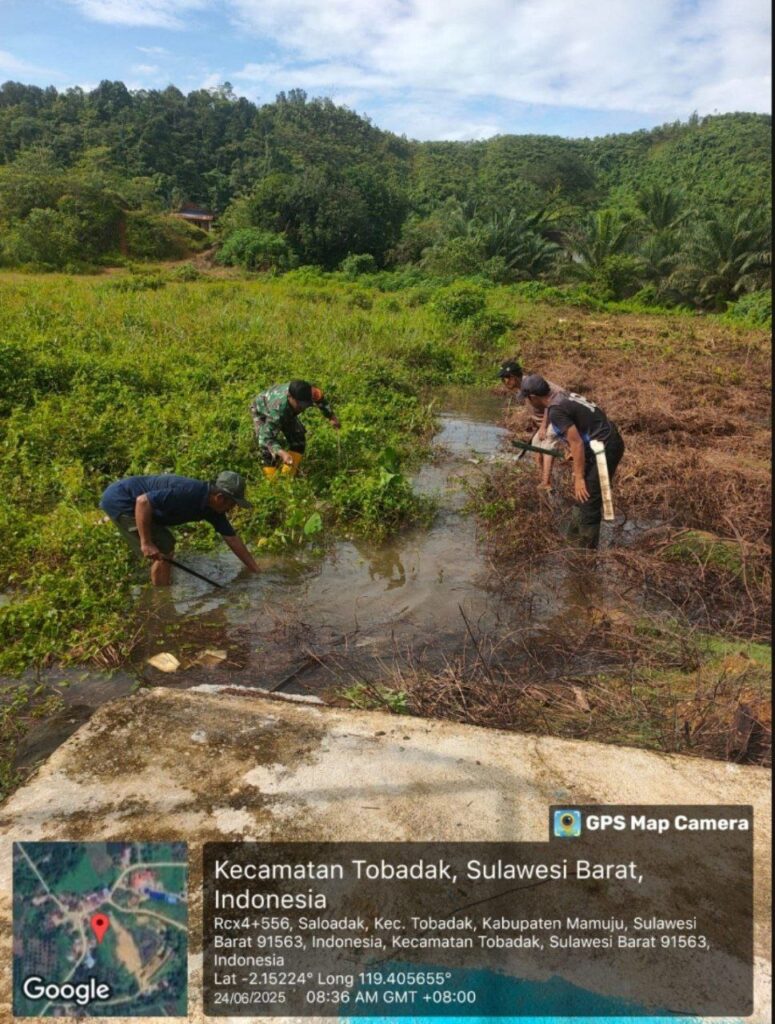 Mamuju – Dalam rangka mendukung kelancaran irigasi pertanian masyarakat, personel Koramil 1418-04/Budong-Budong melaksanakan karya bakti pembersihan saluran air yang tersumbat oleh rumput dan semak belukar, Kegiatan ini berlangsung di Desa Saloadak, Kecamatan Budong-Budong, Kabupaten Mamuju Tengah. Selasa (24/6/2025).
