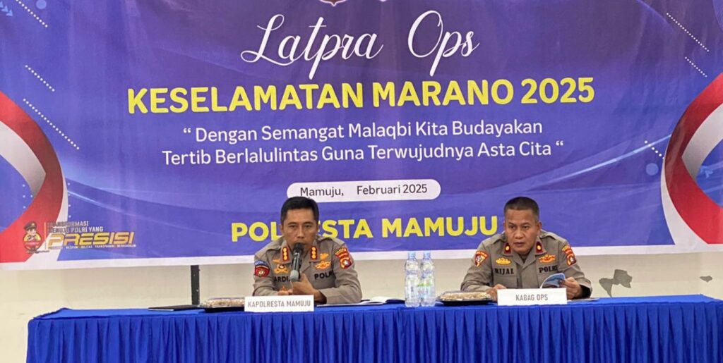 Mamuju – Sebagai bentuk kesiapan Operasi Keselamatan Lalu Lintas Marano 2025, Polresta Mamuju menggelar Latihan Pra Ops di Aula Wira Satya Mapolresta Mamuju, Jumat, 7 Februari 2025