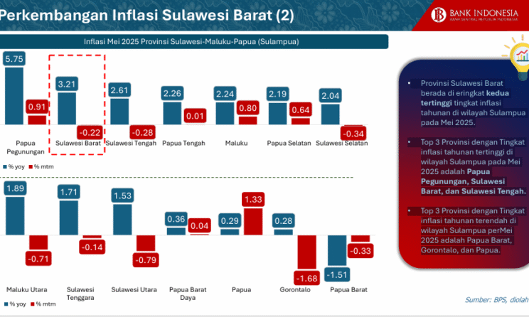 Provinsi Sulawesi Barat berada di eringkat kedua tertinggi tingkat inflasi tahunan di wilayah Sulampua pada Mei 2025.