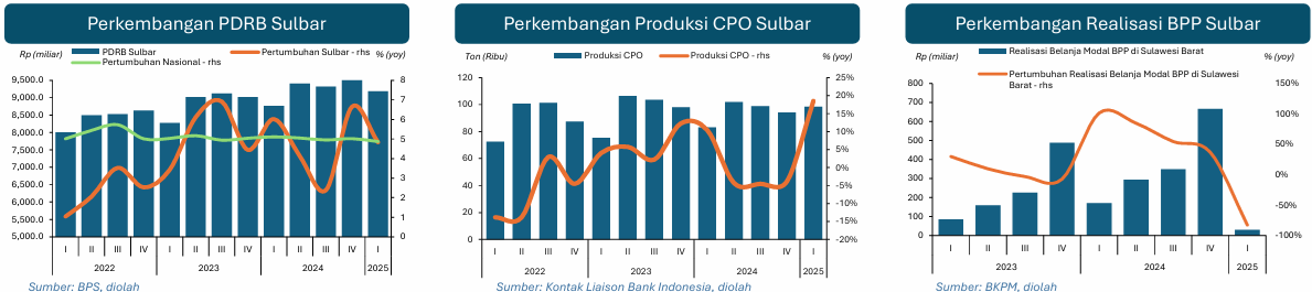 Perekonomian Sulawesi Barat pada triwulan I 2025tumbuh 4,83% (yoy), melambatdibandingkan triwulan sebelumnya sebesar 6,65% (yoy). Angka pertumbuhan tersebut lebih rendah dibandingkan pertumbuhan ekonomi nasional, yakni sebesar 4,87% (yoy).