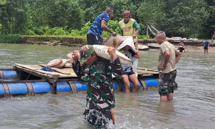“Dengan penuh kehati-hatian, personil Satgas TMMD bersama warga berkoordinasi dan bekerja sama menyeberangkan material agar tidak hanyut terbawa arus,” katanya.