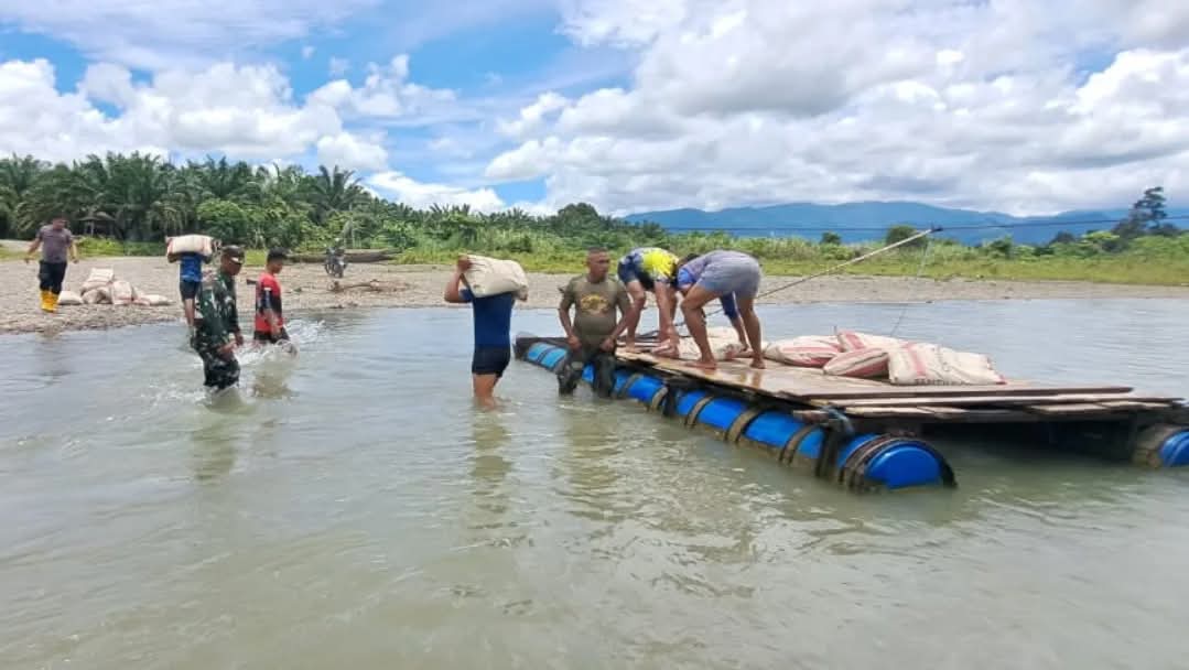 “Dengan penuh kehati-hatian, personil Satgas TMMD bersama warga berkoordinasi dan bekerja sama menyeberangkan material agar tidak hanyut terbawa arus,” katanya.