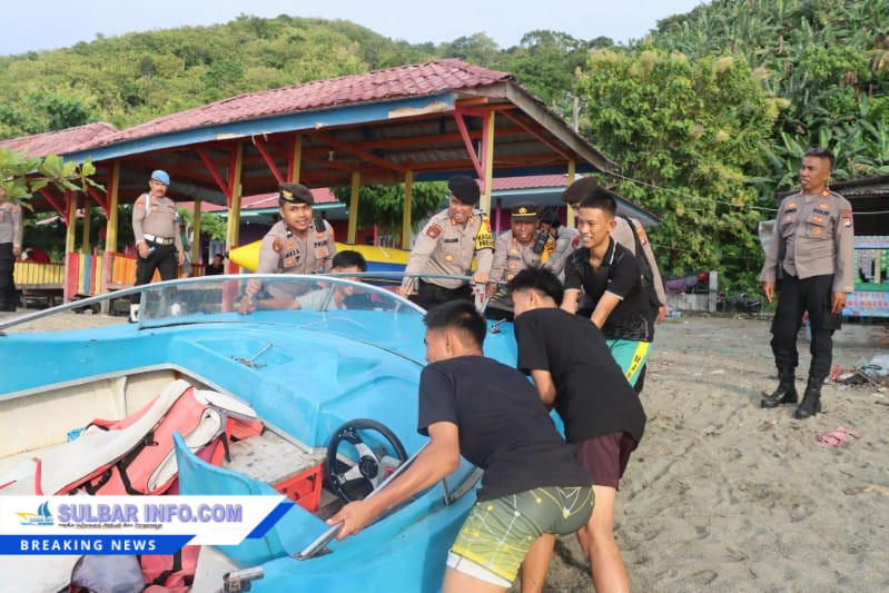 MAMUJU – Kesigapan aparat kepolisian bersama warga kembali terlihat dalam upaya menjaga keselamatan pengunjung wisata di Pantai Malawwa. Sejumlah personel Pos Pantau Polresta Mamuju bahu-membahu dengan masyarakat setempat mengevakuasi satu unit kapal banana boat milik wahana wisata pantai ke daratan, menyusul kondisi air laut yang mulai pasang.
