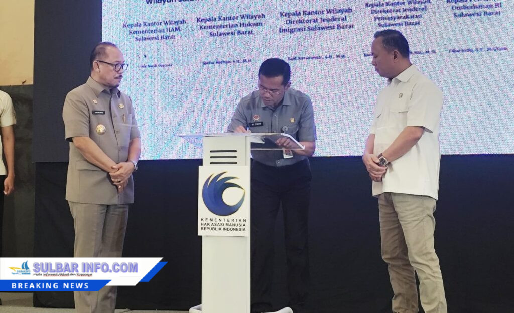 Penandatanganan tersebut dilaksanakan dalam kegiatan Sinergitas Lintas Sektor Kementerian HAM RI Bersama Pemerintah Daerah, Masyarakat, Komunitas, dan Pelaku Usaha di Wilayah Sulawesi Barat dengan tema “HAM Hadir Untuk Bangsa” yang berlangsung di Hotel Maleo, Mamuju, Senin (28/4).